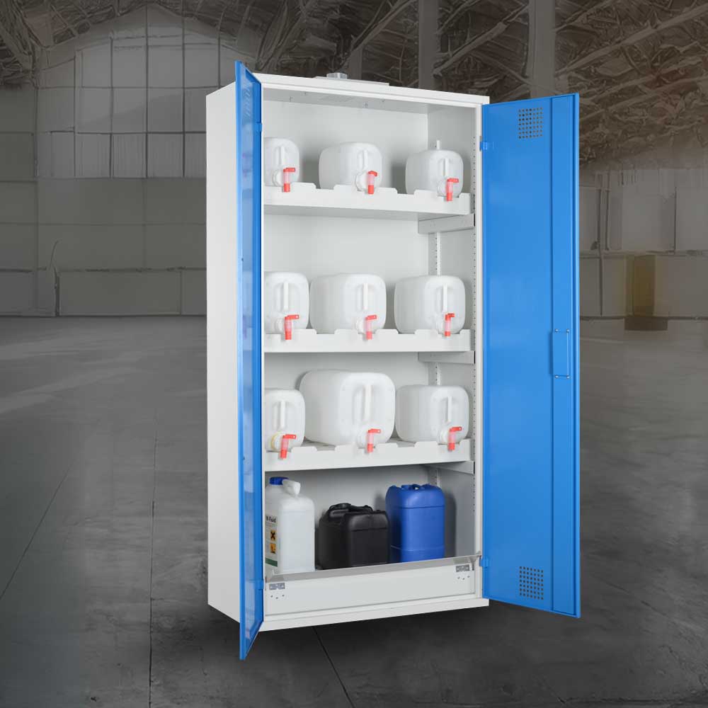 This type is ideal for cans, flasks and containers of various capacities that are in regular use and where protection against leaks, proper vapour drainage and the exclusion of unauthorised access are particularly important. The cabinet is equipped with a lockable door, ventilation slots and a leakage tray, so that all important safety aspects are met.