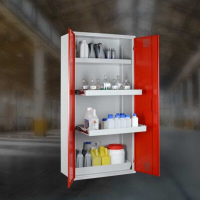 The cabinet has a durable, chemical-resistant powder-coated surface for long life and easy cleaning. Built-in spill trays provide extra protection in case of spills, while lockable doors ensure that only authorised personnel have access to stored materials.