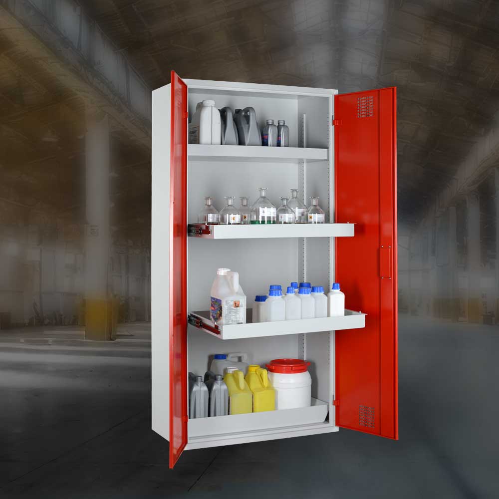 Ergonomically designed pull-out trays allow you to quickly inspect, organise and safely remove materials without having to unpack the entire cabinet. This is particularly useful in environments where a variety of bottles, jugs and containers are stored.