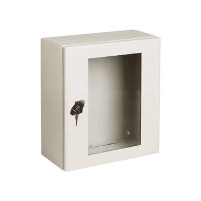 The enclosure is made of solid steel and has a safety glazed door with key lock. The grey (RAL 7035) epoxy-polyester powder coated finish enclosure complies with IEC 62208 and is UL, GL, BV, LR, DNV certified, among others.